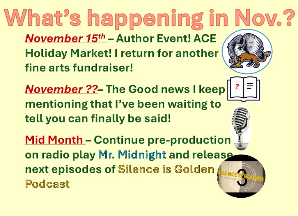 Mid Month – Continue pre-production on radio play Mr. Midnight and release next episodes of Silence is Golden Podcast.